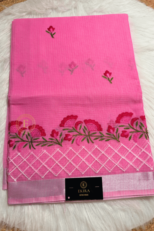 Elegant and feminine, this Pink Kota Cotton Saree features beautiful floral embroidery concentrated along the bottom, adding rich texture and detail to the drape. The body carries small scattered embroidered motifs that give it a subtle, graceful charm. The lightweight Kota weave ensures all-day comfort, while the shimmering zari border brings a festive finish. Paired with a plain running blouse, this saree is perfect for casual celebrations, daytime events, workwear elegance, and gifting.