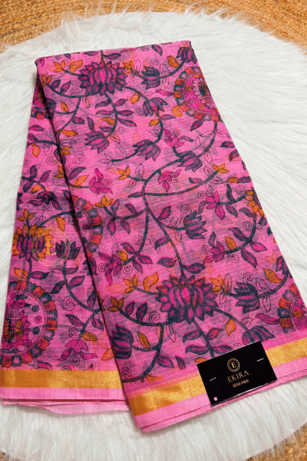 A refreshing blend of elegance and comfort, this Kota Cotton Saree features a beautiful pink base adorned with kalamkari prints. The lightweight Kota weave makes it extremely easy to drape, while the shimmering zari border adds a touch of festive richness. Perfect for daytime events, casual gatherings, workwear elegance, and gifting. Comes with a matching running blouse for a complete coordinated look.